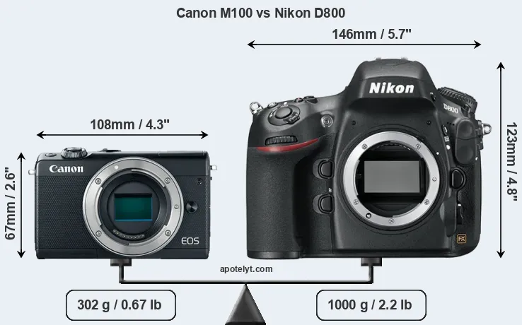If the front view area (width x height) of the cameras is taken as an aggregate measure of their size, the Nikon D800 is considerably larger (148 percent) than the Canon M100. Moreover, the D800 is substantially heavier (231 percent) than the M100. It is noteworthy in this context that the D800 is splash and dust-proof, while the M100 does not feature any corresponding weather-sealing.