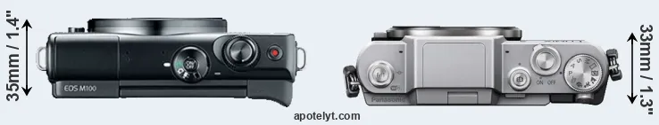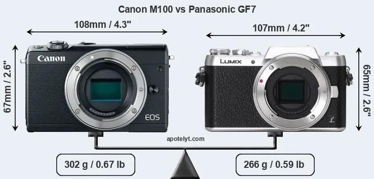 The side-by-side display below illustrates the physical size and weight of the Canon M100 and the Panasonic GF7. The two cameras are presented according to their relative size. Three consecutive perspectives from the front, the top, and the back are available. All width, height and depth measures are rounded to the nearest millimeter.