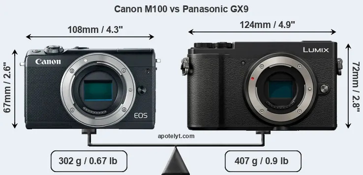 An illustration of the physical size and weight of the Canon M100 and the Panasonic GX9 is provided in the side-by-side display below. The two cameras are presented according to their relative size. Three consecutive views from the front, the top, and the rear side are shown. All width, height and depth measures are rounded to the nearest millimeter.