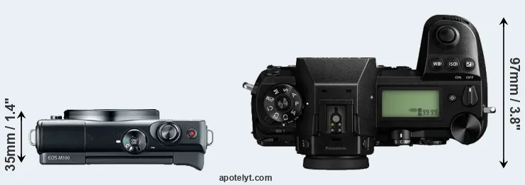 The physical size and weight of the Canon M100 and the Panasonic S1 are illustrated in the side-by-side display below. The two cameras are presented according to their relative size. Three successive views from the front, the top, and the rear are shown. All width, height and depth measures are rounded to the nearest millimeter.