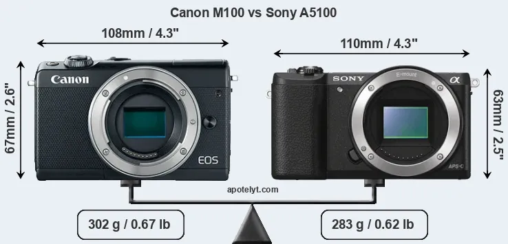 The Canon EOS M100 and the Sony Alpha A5100 are two digital cameras that were announced, respectively, in August 2017 and August 2014. Both the M100 and the A5100 are mirrorless interchangeable lens cameras that are equipped with an APS-C sensor. Both cameras offer a resolution of 24 megapixels.
