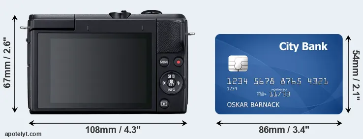 The physical dimensions of the Canon M200 relative to a credit card are illustrated in the side-by-side display below. Three consecutive views from the front, the top, and the rear side are shown. All size dimensions are rounded to the nearest millimeter.