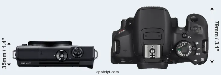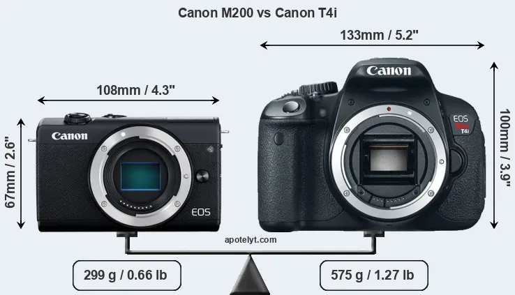The side-by-side display below illustrates the physical size and weight of the Canon M200 and the Canon T4i. The two cameras are presented according to their relative size. Three successive views from the front, the top, and the rear are shown. All width, height and depth measures are rounded to the nearest millimeter.