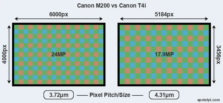 While the two cameras under review share the same sensor size, the M200 offers a higher resolution of 24 megapixels, compared with 17.9 MP of the T4i. This megapixels advantage translates into a 16 percent gain in linear resolution. On the other hand, these sensor specs imply that the M200 has a higher pixel density and a smaller size of the individual pixel (with a pixel pitch of 3.72μm versus 4.31μm for the T4i). In this context, it should be noted, however, that the M200 is much more recent (by 7 years and 3 months) than the T4i, and its sensor will have benefitted from technological advances during this time that compensate for the smaller pixel size.