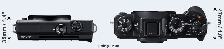 An illustration of the physical size and weight of the Canon M200 and the Fujifilm X-T1 is provided in the side-by-side display below. The two cameras are presented according to their relative size. Three consecutive perspectives from the front, the top, and the back are available. All size dimensions are rounded to the nearest millimeter.
