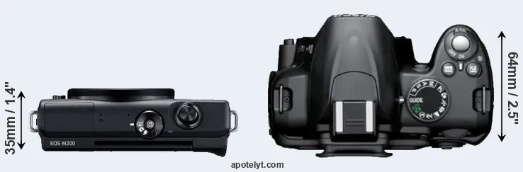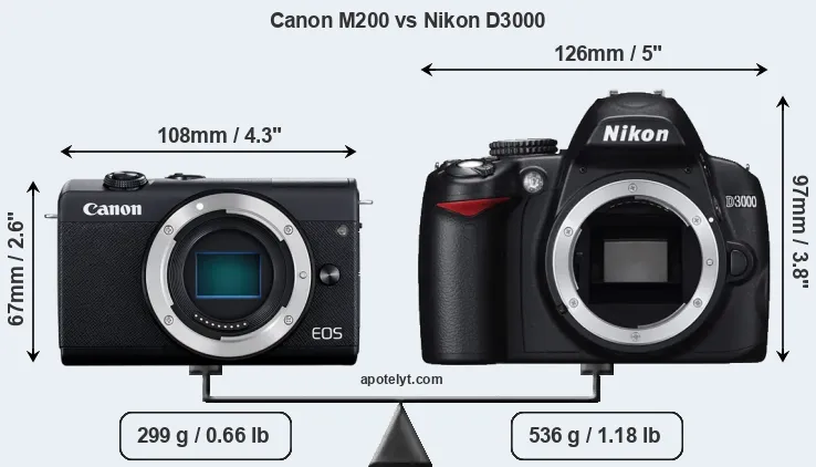An illustration of the physical size and weight of the Canon M200 and the Nikon D3000 is provided in the side-by-side display below. The two cameras are presented according to their relative size. Three consecutive views from the front, the top, and the rear side are shown. All width, height and depth measures are rounded to the nearest millimeter.