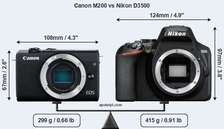 If the front view area (width x height) of the cameras is taken as an aggregate measure of their size, the Nikon D3500 is considerably larger (66 percent) than the Canon M200. Moreover, the D3500 is substantially heavier (39 percent) than the M200. In this context, it is worth noting that neither the M200 nor the D3500 are weather-sealed.