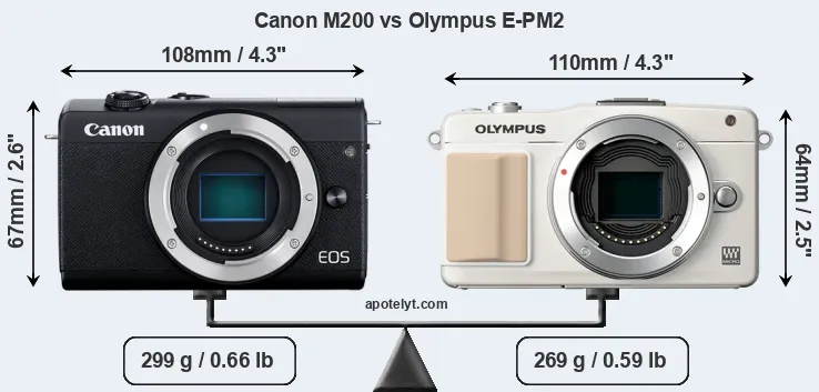 An illustration of the physical size and weight of the Canon M200 and the Olympus E-PM2 is provided in the side-by-side display below. The two cameras are presented according to their relative size. Three consecutive views from the front, the top, and the rear side are shown. All width, height and depth dimensions are rounded to the nearest millimeter.