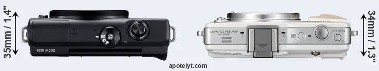 Going beyond this snapshot of core features and characteristics, what are the differences between the Canon EOS M200 and the Olympus PEN E-PM2? Which one should you buy? Read on to find out how these two cameras compare with respect to their body size, their imaging sensors, their shooting features, their input-output connections, and their reception by expert reviewers.