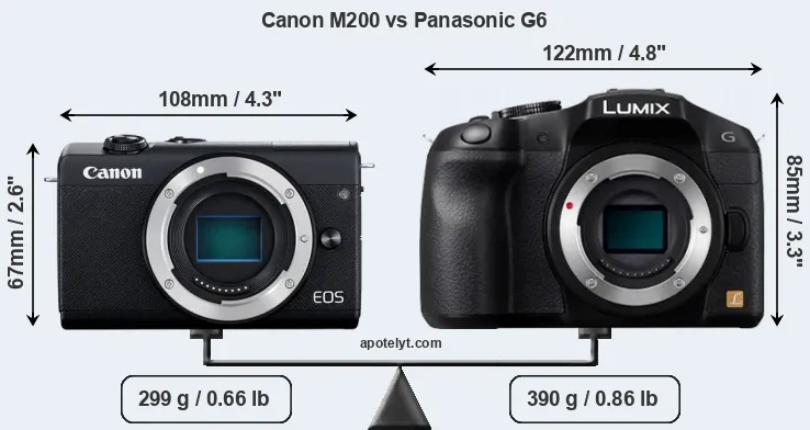 If the front view area (width x height) of the cameras is taken as an aggregate measure of their size, the Panasonic G6 is considerably larger (43 percent) than the Canon M200. Moreover, the G6 is markedly heavier (30 percent) than the M200. In this context, it is worth noting that neither the M200 nor the G6 are weather-sealed.