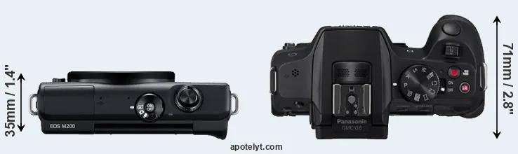 An illustration of the physical size and weight of the Canon M200 and the Panasonic G6 is provided in the side-by-side display below. The two cameras are presented according to their relative size. Three consecutive perspectives from the front, the top, and the back are available. All size dimensions are rounded to the nearest millimeter.