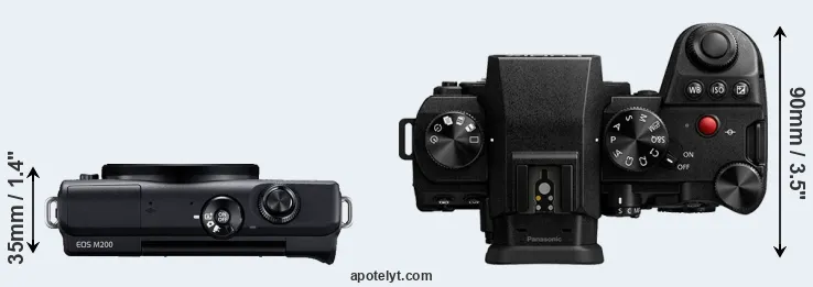 The side-by-side display below illustrates the physical size and weight of the Canon M200 and the Panasonic G9 II. The two cameras are presented according to their relative size. Three consecutive views from the front, the top, and the rear side are shown. All width, height and depth dimensions are rounded to the nearest millimeter.