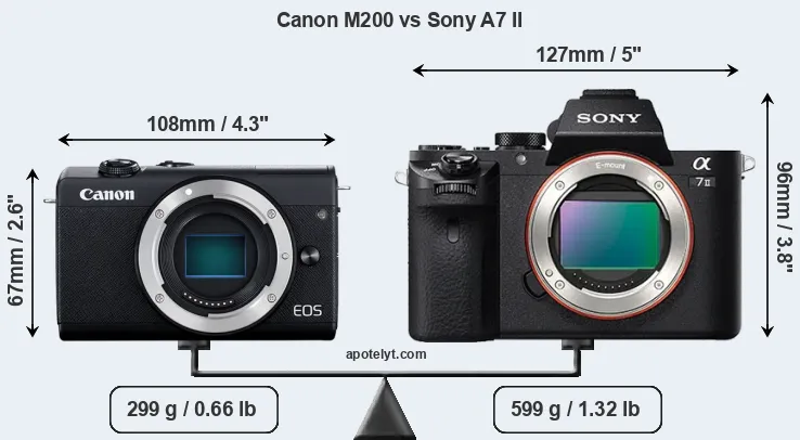 If the front view area (width x height) of the cameras is taken as an aggregate measure of their size, the Sony A7 II is considerably larger (68 percent) than the Canon M200. Moreover, the A7 II is substantially heavier (100 percent) than the M200. It is noteworthy in this context that the A7 II is splash and dust-proof, while the M200 does not feature any corresponding weather-sealing.