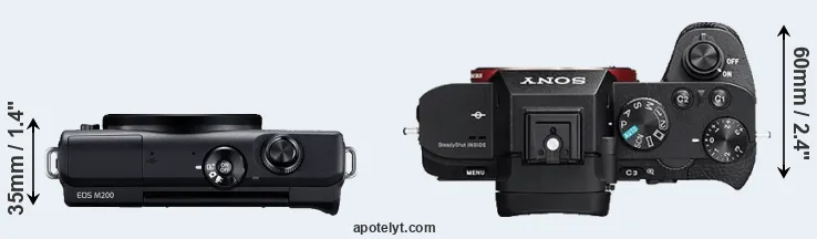 An illustration of the physical size and weight of the Canon M200 and the Sony A7 II is provided in the side-by-side display below. The two cameras are presented according to their relative size. Three consecutive views from the front, the top, and the rear side are shown. All width, height and depth measures are rounded to the nearest millimeter.