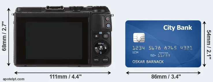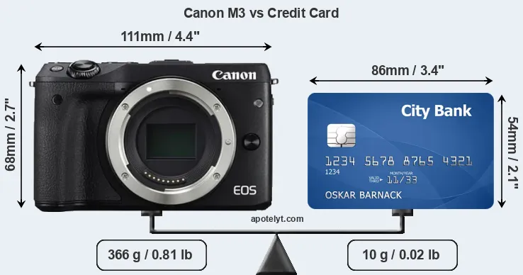 The physical dimensions of the Canon M3 relative to a credit card are illustrated in the side-by-side display below. Three consecutive perspectives from the front, the top, and the back are presented. All width, height and depth measures are rounded to the nearest millimeter.