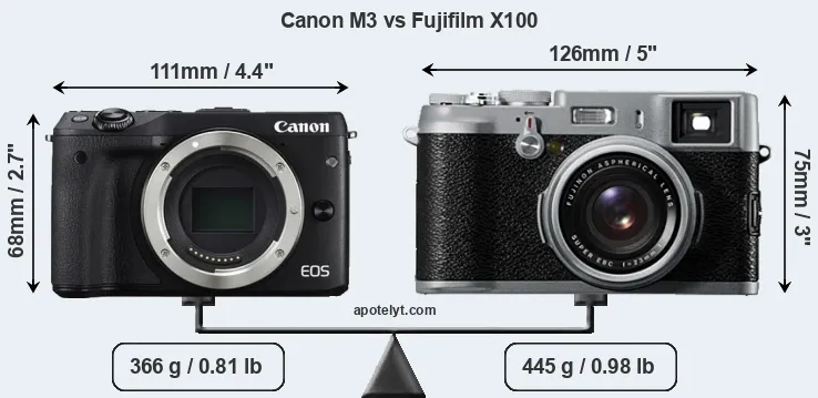 The physical size and weight of the Canon M3 and the Fujifilm X100 are illustrated in the side-by-side display below. The two cameras are presented according to their relative size. Three consecutive perspectives from the front, the top, and the back are available. All width, height and depth dimensions are rounded to the nearest millimeter.