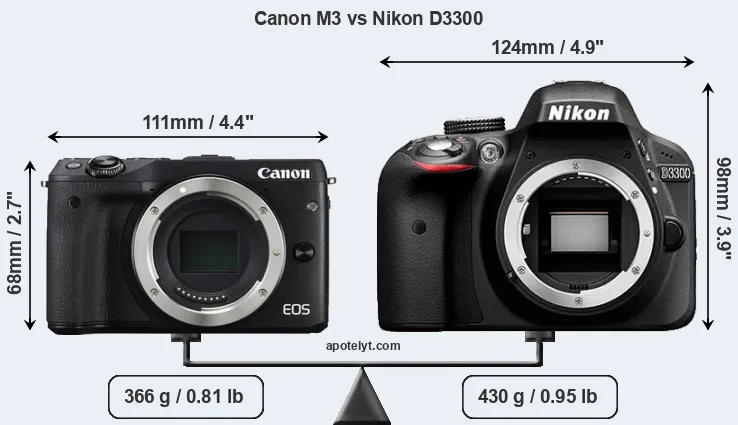 If the front view area (width x height) of the cameras is taken as an aggregate measure of their size, the Nikon D3300 is considerably larger (61 percent) than the Canon M3. Moreover, the D3300 is markedly heavier (17 percent) than the M3. In this context, it is worth noting that neither the M3 nor the D3300 are weather-sealed.