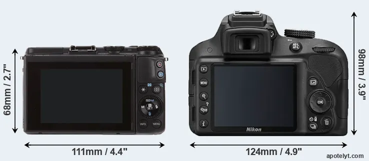 An illustration of the physical size and weight of the Canon M3 and the Nikon D3300 is provided in the side-by-side display below. The two cameras are presented according to their relative size. Three successive views from the front, the top, and the rear are shown. All width, height and depth measures are rounded to the nearest millimeter.