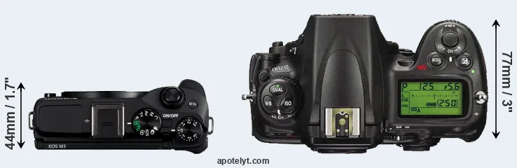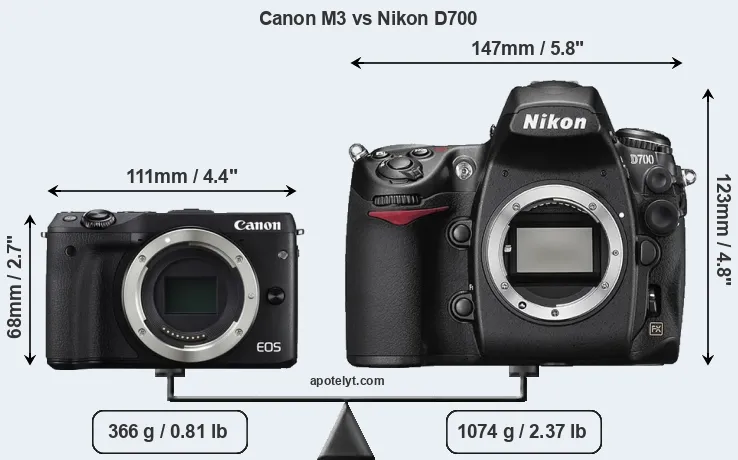 An illustration of the physical size and weight of the Canon M3 and the Nikon D700 is provided in the side-by-side display below. The two cameras are presented according to their relative size. Three successive views from the front, the top, and the rear are shown. All width, height and depth dimensions are rounded to the nearest millimeter.