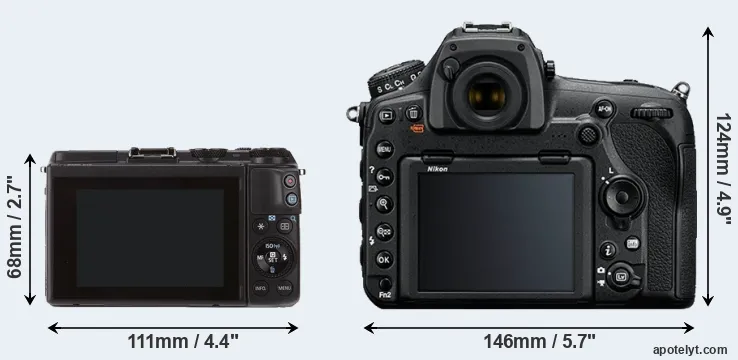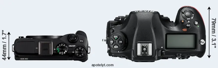 The physical size and weight of the Canon M3 and the Nikon D850 are illustrated in the side-by-side display below. The two cameras are presented according to their relative size. Three consecutive views from the front, the top, and the rear side are shown. All width, height and depth measures are rounded to the nearest millimeter.