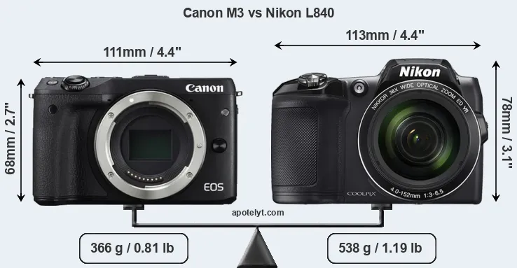 The physical size and weight of the Canon M3 and the Nikon L840 are illustrated in the side-by-side display below. The two cameras are presented according to their relative size. Three consecutive views from the front, the top, and the rear side are shown. All width, height and depth measures are rounded to the nearest millimeter.