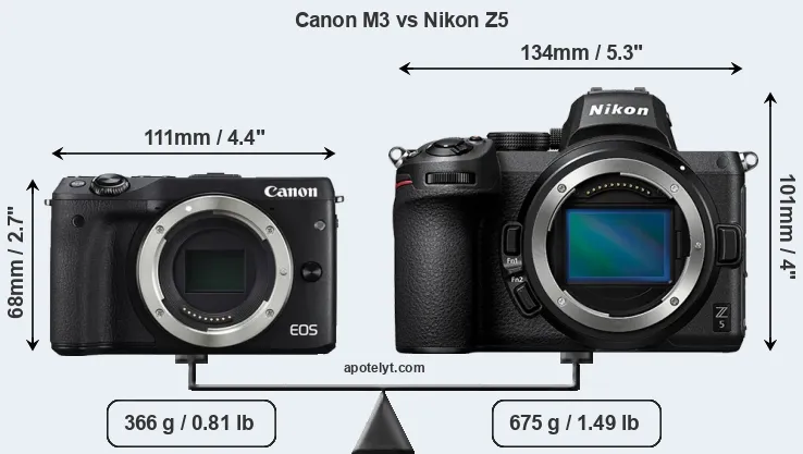 If the front view area (width x height) of the cameras is taken as an aggregate measure of their size, the Nikon Z5 is considerably larger (79 percent) than the Canon M3. Moreover, the Z5 is substantially heavier (84 percent) than the M3. It is noteworthy in this context that the Z5 is splash and dust-proof, while the M3 does not feature any corresponding weather-sealing.