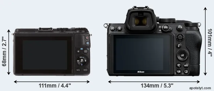The physical size and weight of the Canon M3 and the Nikon Z5 are illustrated in the side-by-side display below. The two cameras are presented according to their relative size. Three successive views from the front, the top, and the rear are shown. All width, height and depth measures are rounded to the nearest millimeter.