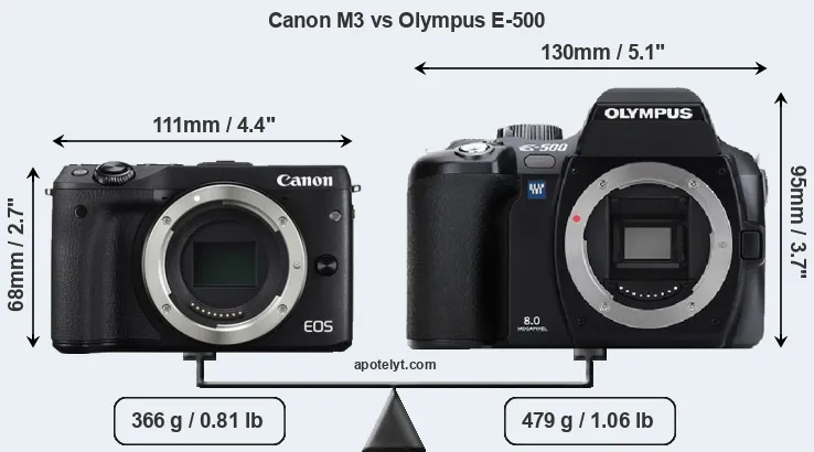 If the front view area (width x height) of the cameras is taken as an aggregate measure of their size, the Olympus E-500 is considerably larger (64 percent) than the Canon M3. Moreover, the E-500 is markedly heavier (31 percent) than the M3. In this context, it is worth noting that neither the M3 nor the E-500 are weather-sealed.