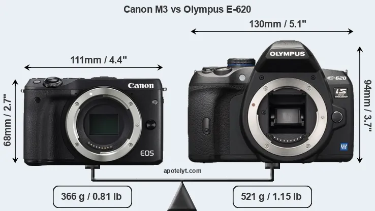 If the front view area (width x height) of the cameras is taken as an aggregate measure of their size, the Olympus E-620 is considerably larger (62 percent) than the Canon M3. Moreover, the E-620 is substantially heavier (42 percent) than the M3. In this context, it is worth noting that neither the M3 nor the E-620 are weather-sealed.