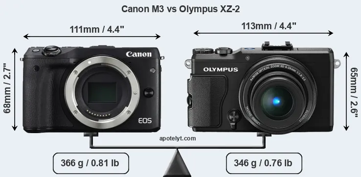 The physical size and weight of the Canon M3 and the Olympus XZ-2 are illustrated in the side-by-side display below. The two cameras are presented according to their relative size. Three consecutive perspectives from the front, the top, and the back are available. All size dimensions are rounded to the nearest millimeter.