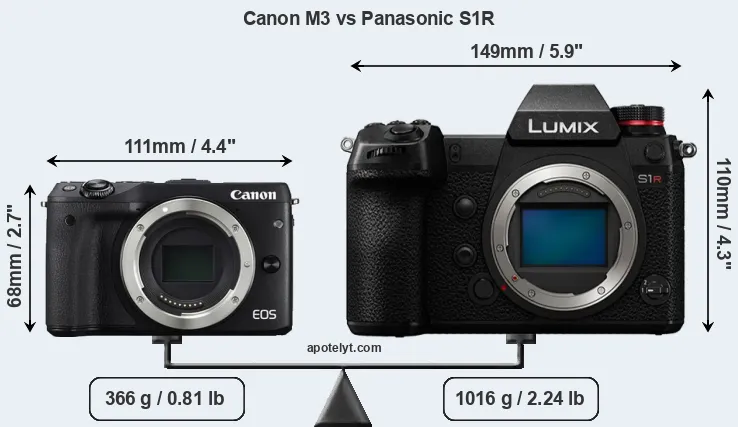 If the front view area (width x height) of the cameras is taken as an aggregate measure of their size, the Panasonic S1R is considerably larger (117 percent) than the Canon M3. Moreover, the S1R is substantially heavier (178 percent) than the M3. It is noteworthy in this context that the S1R is splash and dust-proof, while the M3 does not feature any corresponding weather-sealing.