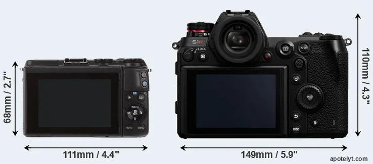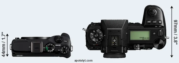The side-by-side display below illustrates the physical size and weight of the Canon M3 and the Panasonic S1R. The two cameras are presented according to their relative size. Three consecutive perspectives from the front, the top, and the back are available. All size dimensions are rounded to the nearest millimeter.