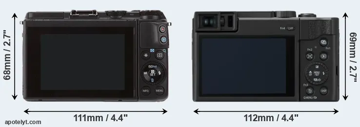 The side-by-side display below illustrates the physical size and weight of the Canon M3 and the Panasonic ZS80. The two cameras are presented according to their relative size. Three consecutive views from the front, the top, and the rear side are shown. All width, height and depth dimensions are rounded to the nearest millimeter.