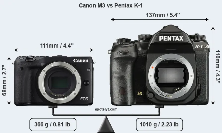 If the front view area (width x height) of the cameras is taken as an aggregate measure of their size, the Pentax K-1 is considerably larger (100 percent) than the Canon M3. Moreover, the K-1 is substantially heavier (176 percent) than the M3. It is noteworthy in this context that the K-1 is splash and dust-proof, while the M3 does not feature any corresponding weather-sealing.