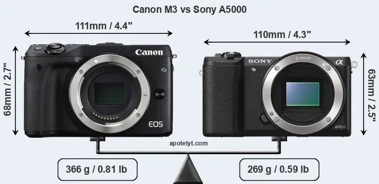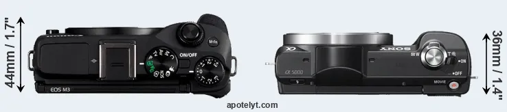 The physical size and weight of the Canon M3 and the Sony A5000 are illustrated in the side-by-side display below. The two cameras are presented according to their relative size. Three consecutive views from the front, the top, and the rear side are shown. All size dimensions are rounded to the nearest millimeter.