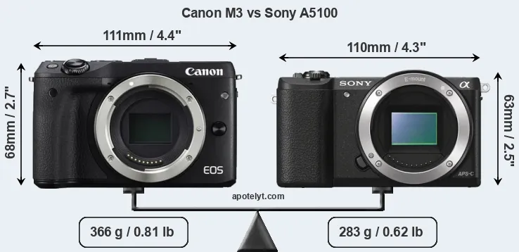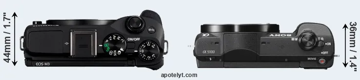 The side-by-side display below illustrates the physical size and weight of the Canon M3 and the Sony A5100. The two cameras are presented according to their relative size. Three consecutive views from the front, the top, and the rear side are shown. All width, height and depth measures are rounded to the nearest millimeter.
