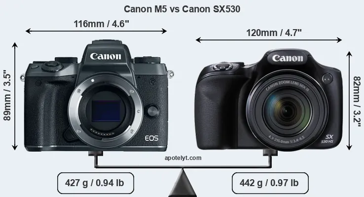 The Canon EOS M5 and the Canon PowerShot SX530 HS are two digital cameras that were revealed to the public, respectively, in September 2016 and January 2015. The M5 is a mirrorless interchangeable lens camera, while the SX530 is a fixed lens compact. The cameras are based on an APS-C (M5) and a 1/2.3-inch (SX530) sensor. The M5 has a resolution of 24 megapixels, whereas the SX530 provides 15.9 MP.