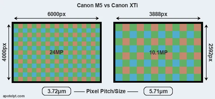With 24MP, the M5 offers a higher resolution than the XTi (10.1MP), but the M5 has smaller individual pixels (pixel pitch of 3.72μm versus 5.71μm for the XTi). However, the M5 is a much more recent model (by 10 years) than the XTi, and its sensor will have benefitted from technological advances during this time that enhance the light gathering capacity of its pixels.