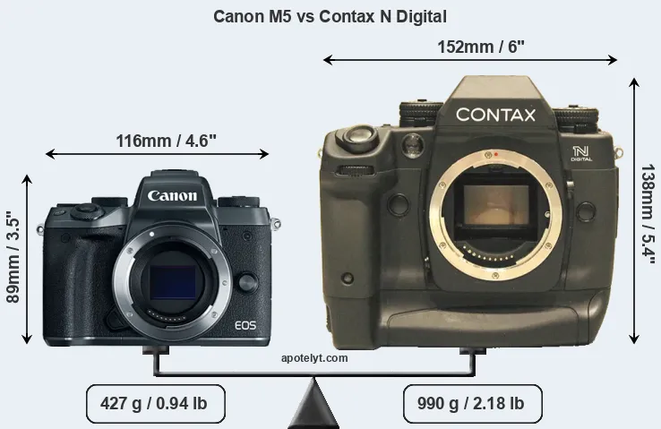 If the front view area (width x height) of the cameras is taken as an aggregate measure of their size, the Contax N Digital is considerably larger (103 percent) than the Canon M5. Moreover, the N Digital is substantially heavier (132 percent) than the M5. In this context, it is worth noting that neither the M5 nor the N Digital are weather-sealed.