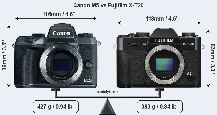 If the front view area (width x height) of the cameras is taken as an aggregate measure of their size, the Fujifilm X-T20 is notably smaller (5 percent) than the Canon M5. Moreover, the X-T20 is markedly lighter (10 percent) than the M5. In this context, it is worth noting that neither the M5 nor the X-T20 are weather-sealed.