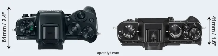 The physical size and weight of the Canon M5 and the Fujifilm X-T20 are illustrated in the side-by-side display below. The two cameras are presented according to their relative size. Three consecutive perspectives from the front, the top, and the back are available. All size dimensions are rounded to the nearest millimeter.