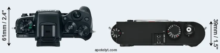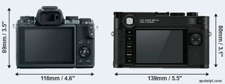 Going beyond this snapshot of core features and characteristics, what are the differences between the Canon EOS M5 and the Leica M10 (Typ 3656)? Which one should you buy? Read on to find out how these two cameras compare with respect to their body size, their imaging sensors, their shooting features, their input-output connections, and their reception by expert reviewers.