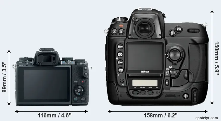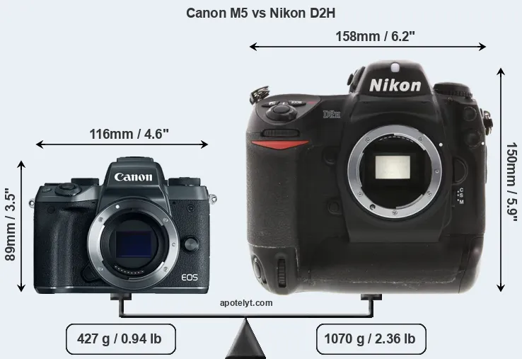 If the front view area (width x height) of the cameras is taken as an aggregate measure of their size, the Nikon D2H is considerably larger (130 percent) than the Canon M5. Moreover, the D2H is substantially heavier (151 percent) than the M5. It is noteworthy in this context that the D2H is splash and dust-proof, while the M5 does not feature any corresponding weather-sealing.