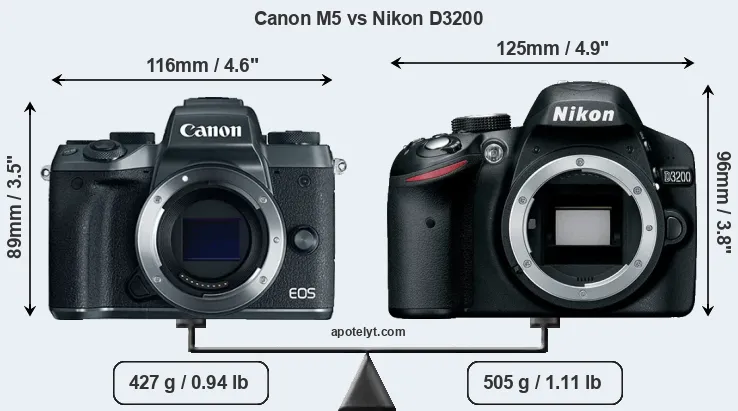 If the front view area (width x height) of the cameras is taken as an aggregate measure of their size, the Nikon D3200 is notably larger (16 percent) than the Canon M5. Moreover, the D3200 is markedly heavier (18 percent) than the M5. In this context, it is worth noting that neither the M5 nor the D3200 are weather-sealed.