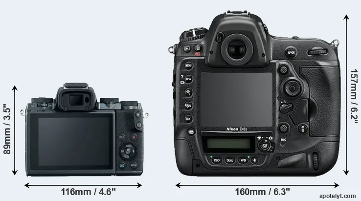 Going beyond this snapshot of core features and characteristics, what are the differences between the Canon EOS M5 and the Nikon D4S? Which one should you buy? Read on to find out how these two cameras compare with respect to their body size, their imaging sensors, their shooting features, their input-output connections, and their reception by expert reviewers.