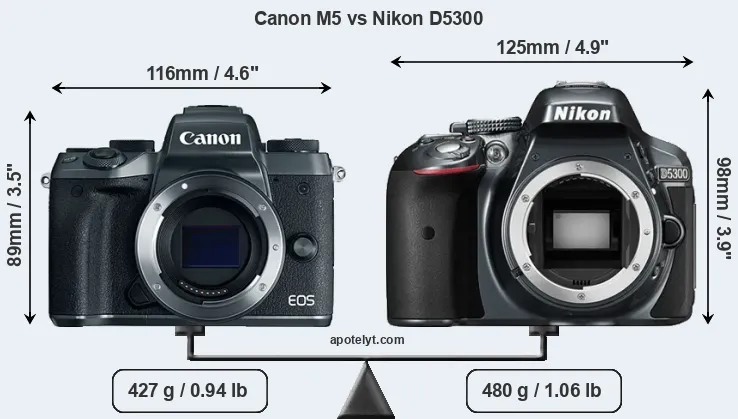 If the front view area (width x height) of the cameras is taken as an aggregate measure of their size, the Nikon D5300 is notably larger (19 percent) than the Canon M5. Moreover, the D5300 is markedly heavier (12 percent) than the M5. In this context, it is worth noting that neither the M5 nor the D5300 are weather-sealed.