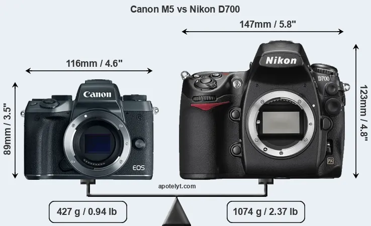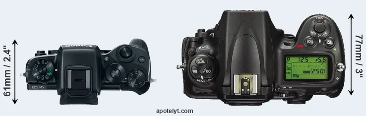 If the front view area (width x height) of the cameras is taken as an aggregate measure of their size, the Nikon D700 is considerably larger (75 percent) than the Canon M5. Moreover, the D700 is substantially heavier (152 percent) than the M5. It is noteworthy in this context that the D700 is splash and dust-proof, while the M5 does not feature any corresponding weather-sealing.