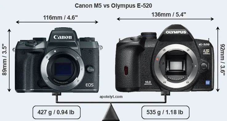 An illustration of the physical size and weight of the Canon M5 and the Olympus E-520 is provided in the side-by-side display below. The two cameras are presented according to their relative size. Three consecutive perspectives from the front, the top, and the back are available. All width, height and depth measures are rounded to the nearest millimeter.