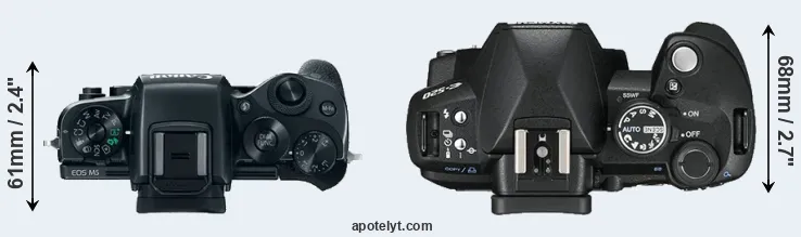 If the front view area (width x height) of the cameras is taken as an aggregate measure of their size, the Olympus E-520 is notably larger (21 percent) than the Canon M5. Moreover, the E-520 is markedly heavier (25 percent) than the M5. In this context, it is worth noting that neither the M5 nor the E-520 are weather-sealed.