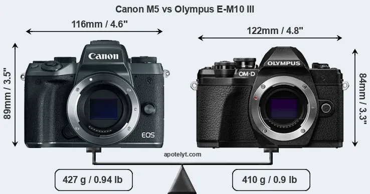 If the front view area (width x height) of the cameras is taken as an aggregate measure of their size, the Canon M5 and the Olympus E-M10 III are of equal size. However, the E-M10 III is slightly lighter (4 percent) than the M5. In this context, it is worth noting that neither the M5 nor the E-M10 III are weather-sealed.